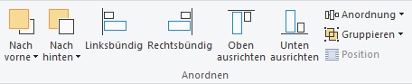 Über die Registerkarte "Start" stehen in der Gruppe "Anordnen" (Objekte > Anordnen > Anordnung) Ausrichtungsfunktionen zur Verfügung, um mehrere Objekte aneinander ausrichten. Es müssen mindestens 2 Objekte markiert sein, damit die Funktionen verfügbar sind.