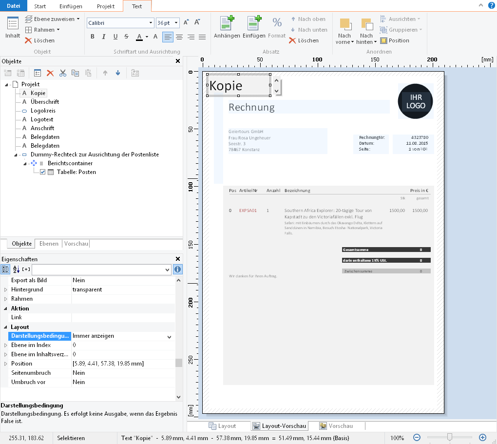 6. Im Objektdialog selektieren Sie das Textobjekt und setzen die Objekt-Eigenschaft "Anzeigebedingung für Ausfertigungsdruck" auf den Wert IssueIndex()=2. Somit wird dieses Objekt nur bei der 2. Ausfertigung gedruckt.