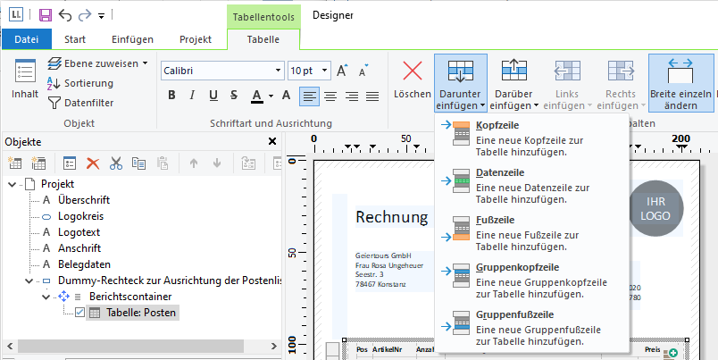 Da die Summen am Ende der Tabelle ausgegeben werden sollen, definieren Sie für die Ausgabe eine Fußzeile.