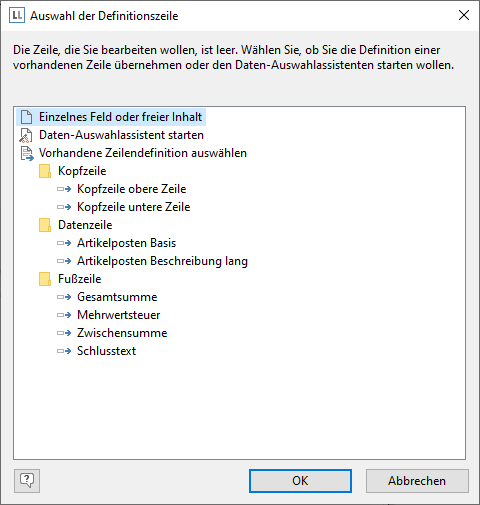 2. Nun werden Sie gefragt, ob Sie eine bestehende Zeilendefinition von einer der anderen Zeilentypen übernehmen wollen. Dies würde aber an dieser Stelle keinerlei Zeitersparnis bedeuten. Daher wählen Sie den Eintrag "Einzelnes Feld oder freier Inhalt".