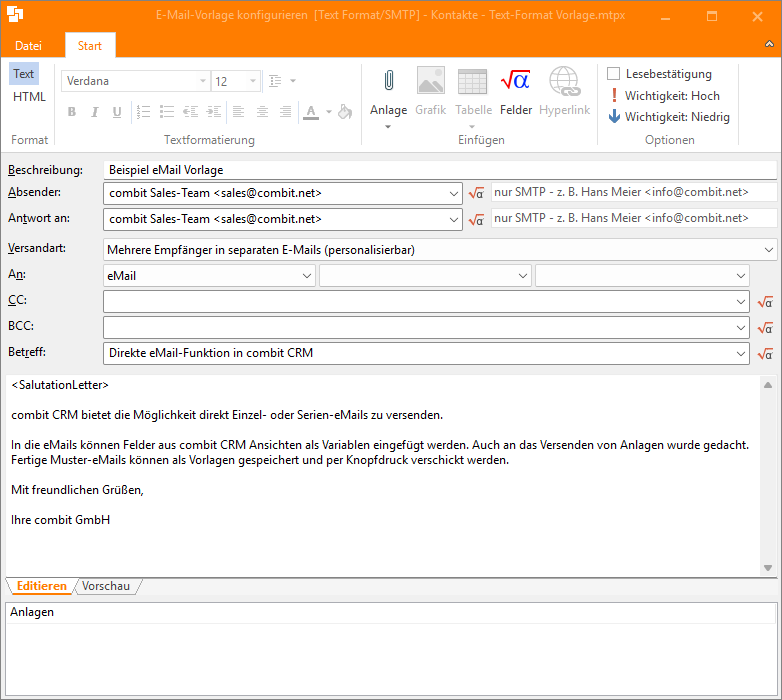 In einer E-Mail-Vorlage ist der gesamte Aufbau der E-Mail, inkl. Betreff, Text, Feldvariablen, Formatierungen (HTML-E-Mails) und eventuellen Anlagen enthalten. Abgespeichert lassen sie sich immer wieder verwenden. Diese Vorlagen funktionieren ähnlich wie die Dokumentvorlagen in Ihrer Textverarbeitung.