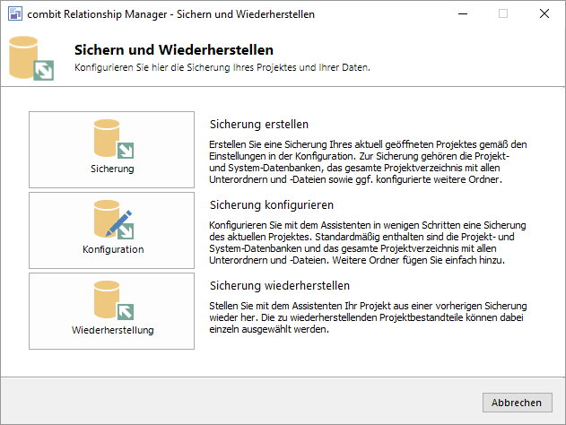 Mit dem Assistenten für die Sicherung und Wiederherstellung können Sie eine Sicherung des Projekts, der Projektdatenbank und der Systemdatenbank durchführen. Außerdem können Sie eine regelmäßige Sicherung einrichten. Dabei wird das gesamte Projektverzeichnis gesichert. Optional können weitere Ordner der Sicherung hinzugefügt werden. Die Sicherungen werden als zip-Archiv gespeichert. Den Assistenten starten Sie über Datei > Verwalten > Sichern und Wiederherstellen.