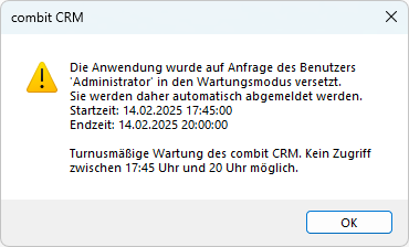 Betroffene Benutzer erhalten eine definierbare Nachricht und werden zu dem vorgegebenen Zeitpunkt vom System automatisch abgemeldet. Laufende Scripte, offene Dialoge oder Eingabemasken werden hierbei im Zweifelsfall terminiert und die Daten zu dem vorgesehenen Zeitpunkt nicht gespeichert.
