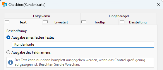 Auf der Registerkarte "Text" geben Sie die Beschriftung für die Checkbox an.