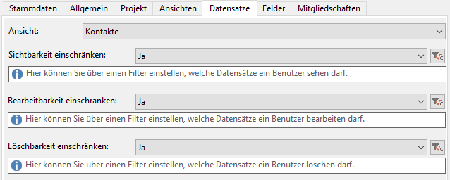 Auf der Registerkarte "Datensätze" können Sie Rechte für Sichtbarkeit, Bearbeitbarkeit und Löschbarkeit auf Datensatzebene definieren. Die entsprechenden Benutzer können dann in der angegebenen Ansicht nur noch die festgelegten Datensätze sehen, bearbeiten bzw. löschen.
