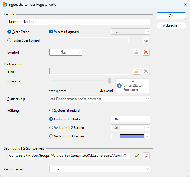 ▪ Sie haben zudem die Möglichkeit, eine Bedingung festzulegen, unter der eine Registerkarte sichtbar ist. So kann beispielsweise eine Registerkarte nur für eine bestimmte Benutzergruppe oder in Abhängigkeit von anderen Feldinhalten sichtbar sein. Diese Funktion ersetzt jedoch nicht die Rechteverwaltung.