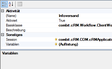 ▪ Variablen: Sie können globale Variablen definieren, die im gesamten Workflow zur Verfügung stehen. Diese globalen Variablen können zum "zwischenparken" von Werten genutzt werden, die sich verändern und zu einem späteren Zeitpunkt im Workflow verwendet werden sollen. Um diese Workflow-Variablen an das Resultat einer Aktivität zu binden, klicken Sie direkt auf das gelbe Datenbank-Symbol in der Eigenschaftsliste.