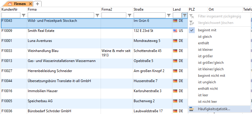 Über Filten > Häufigkeitsstatistik oder den Eintrag "Häufigkeitsstatistik über Feld" im Kontextmenü der jeweiligen Felder der Eingabemaske oder "Häufigkeitsstatistik" im Filtermenü in der Übersichtsliste erhalten Sie das Statistikergebnis in Form einer Liste.