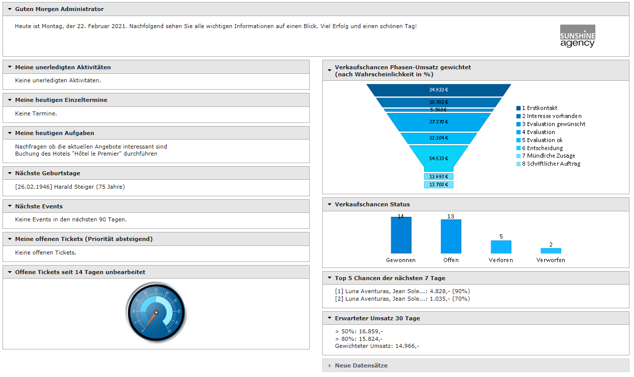 ▪ Top Chancen 7 Tage: Es werden die 5 Verkaufschancen mit der höchsten Wahrscheinlichkeit angezeigt, deren Status auf "Offen" steht und deren Plandatum in den nächsten 7 Tagen ist.