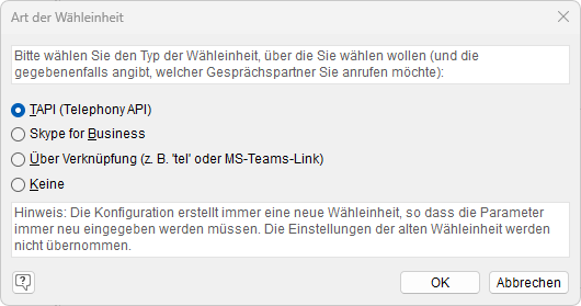 Wählen Sie zuerst die Wähleinheit aus. Die am weitesten verbreitete Wählschnittstelle ist TAPI. Die entsprechenden Treiber sind im Lieferumfang der meisten Telefonanlagen, beziehungsweise der Endgeräte enthalten. Ansonsten sollten Sie sich beim Hersteller nach einem TAPI-Treiber erkundigen.