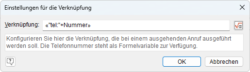 ▪ Über Verknüpfung (z. B. "tel" oder MS-Teams-Link): Konfigurieren Sie über den Formel-Assistent die Verknüpfung, die bei einem ausgehenden Anruf ausgeführt werden soll. Die Telefonnummer steht als Formelvariable zur Verfügung, z. B. «"tel:"+Nummer»