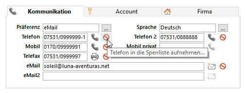 Zusätzlich zum Status eines Kommunikationsfeldes gibt es noch unsere Sperrliste. Es handelt sich dabei um ein "Sicherheitsnetz": Setzen Sie für den Inhalt eines Kommunikationsfeldes den Status "gesperrt", wird dieser zusätzlich auf eine globale Sperrliste in combit CRM gesetzt: Dadurch wird selbst eine unabsichtliche Kontaktaufnahme per E-Mail oder Telefon aus der Software heraus zuverlässig verhindert. Auch dann, wenn z. B. der Status dieser E-Mail-Adresse bei einem anderen Datensatz nicht als "gesperrt" gekennzeichnet wurde.
