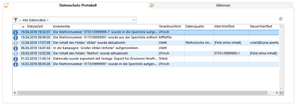 Das Setzen des Status und das Hinzufügen und Entfernen von Sperrlisten-Einträgen ist in unserer Lösung für alle Telefonnummern und E-Mail-Adressen in der Ansicht "Kontakte" bereits für Sie vorkonfiguriert. Es gilt aber auch hier: Sie können diese Lösungen auch in eigene Ansichten für eigene Felder vom Typ "E-Mail" oder "Rufnummer" übernehmen. Ein entsprechender datenschutzrechtlicher Nachweis wird vollautomatisch im Datenschutz-Protokoll angefertigt.