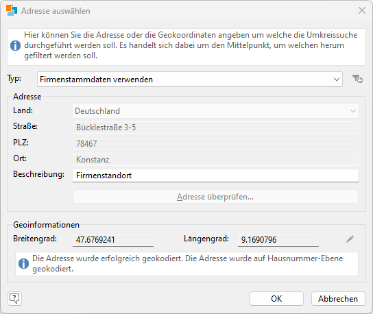Sofern für die Adresse noch keine Geokoordinaten gefunden wurden, können Sie diese über "Adresse überprüfen" geokodieren.