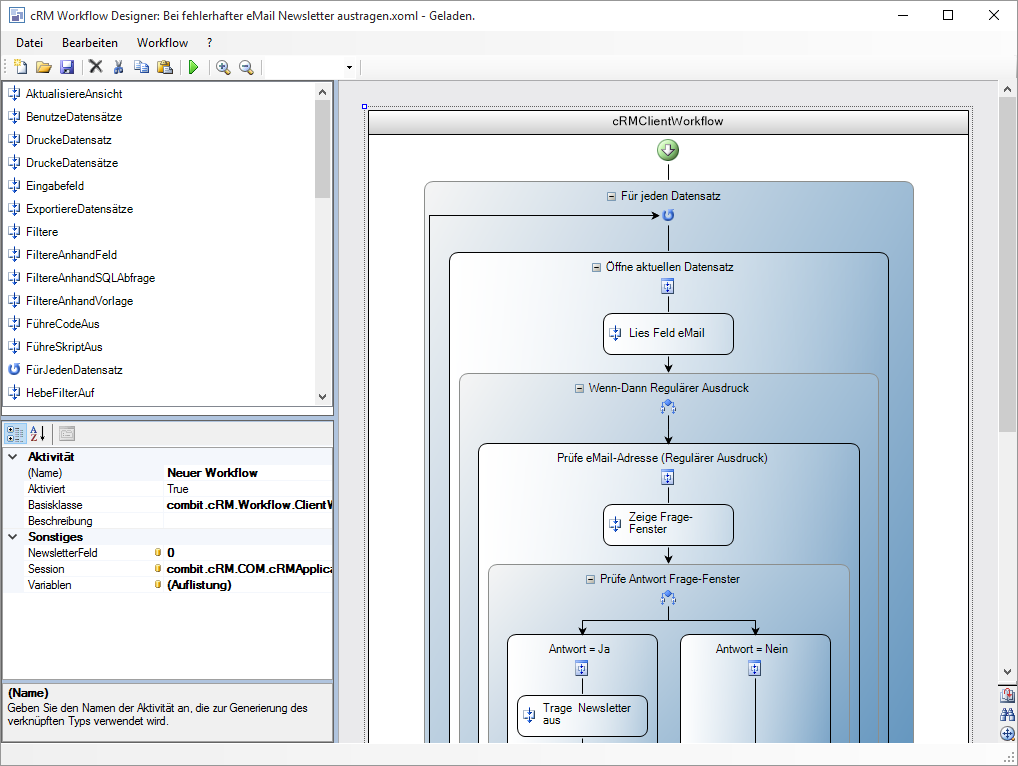 Ein Workflow (Arbeitsablauf) ist eine vordefinierte Abfolge von Aktivitäten. Das Ziel ist hierbei eine mögliche (Teil-)Automatisierung der Ausführung, also z. B. die Telefonnummer des aktuellen Datensatzes auslesen und einen Anruf starten.