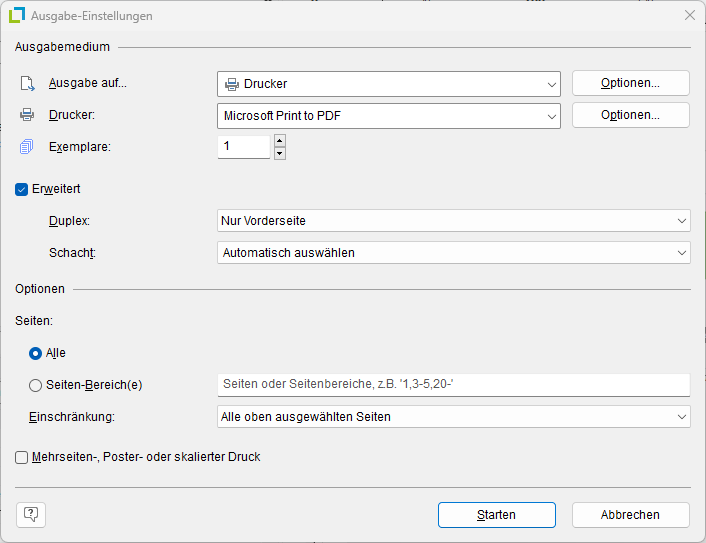 ▪ Über "Seiten" können Sie bestimmte Seiten oder einen bestimmten Seitenbereich (z. B. 1, 3-4, 10-) definieren.