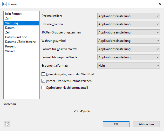 4. Daraufhin erscheint ein Auswahldialog in dem Sie die gewünschte Formatierung für das numerische Feld auswählen können. Wählen Sie dazu auf der linken Seite die Art, also beispielsweise "Währung". Im rechten Bereich des Dialogs können Sie dann detailliert festlegen, wie die Währungsformatierung aussehen soll. Dabei wird standardmäßig die jeweilige Applikationseinstellung verwendet. Alternativ kann die Systemeinstellung oder eine benutzerdefinierte Einstellung gewählt werden.