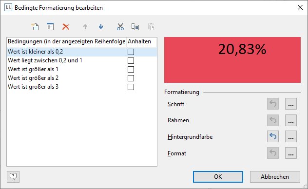 Mit der Eigenschaft bedingte Formatierung kann die Schrift- und Hintergrundfarbe, der Rahmen und das Format bestimmt werden. Zur Definition steht ein Dialog zur Verfügung.