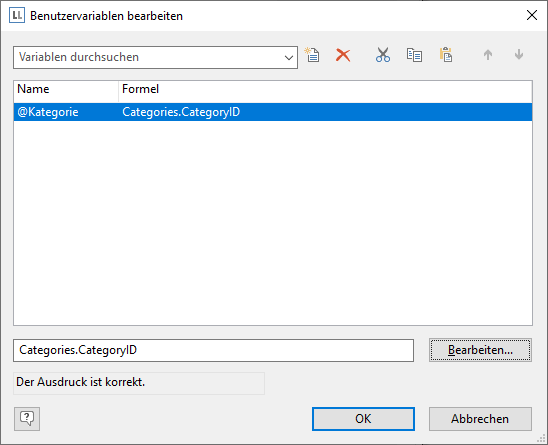 4. Über die Schaltfläche "Bearbeiten" öffnen Sie den Formel-Assistenten um der neuen Benutzervariablen ein Feld oder einen Ausdruck zuzuweisen.