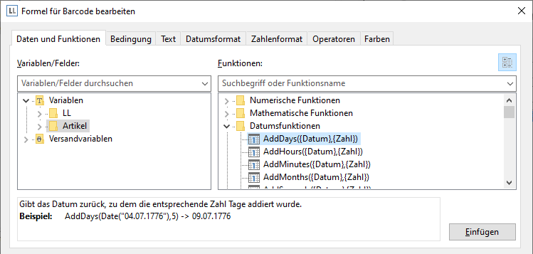 ▪ Wenn Sie eine der Funktionen selektieren, erhalten Sie im Infobereich unten eine kurze Erläuterung dazu. Um die Funktion in die Bearbeitungszeile zu übernehmen, doppelklicken Sie auf die gewünschte Funktion, betätigen die Schaltfläche "Einfügen" oder ziehen ein Feld/eine Variable auf die Funktion.