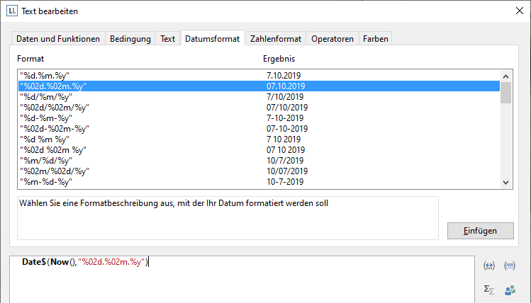Über die Funktion Date$() können Datumswerte formatiert werden. Damit Sie den Formatierungs-Parameter nicht selbst erstellen müssen, können Sie über die Registerkarte "Datumsformat" diesen Parameter aus einer Liste auswählen.