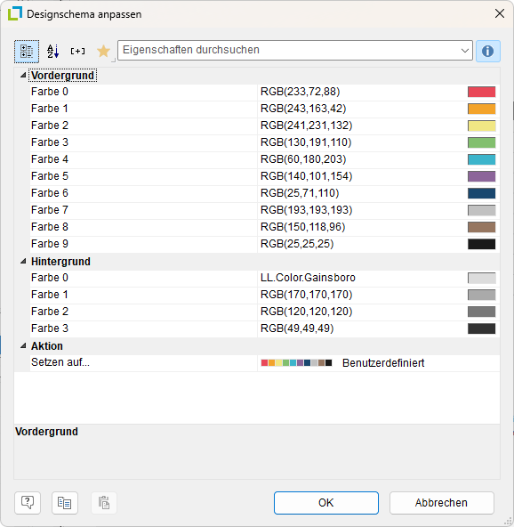 Zehn Schemafarben für den Vordergrund: Steht in den Objekten als LL.Scheme.Color0…9 zur Auswahl. Die Farbe kann über einen Farb-Dialog, eine Auswahlliste mit vordefinierten Farben oder über eine Formel bzw. Funktion frei bestimmt werden (Eintrag "Formel" am Ende der Liste). Als Funktion nutzen Sie die Funktion RGB() oder HSL() |