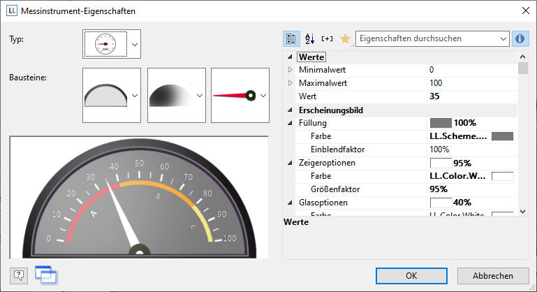 2. Über die Eigenschaft "Wert" bestimmen Sie den Wert den der Zeiger anzeigen soll, z. B. Umsatz oder Rating des Kunden. Hier könnte die Precalc()-Funktion nützlich sein.