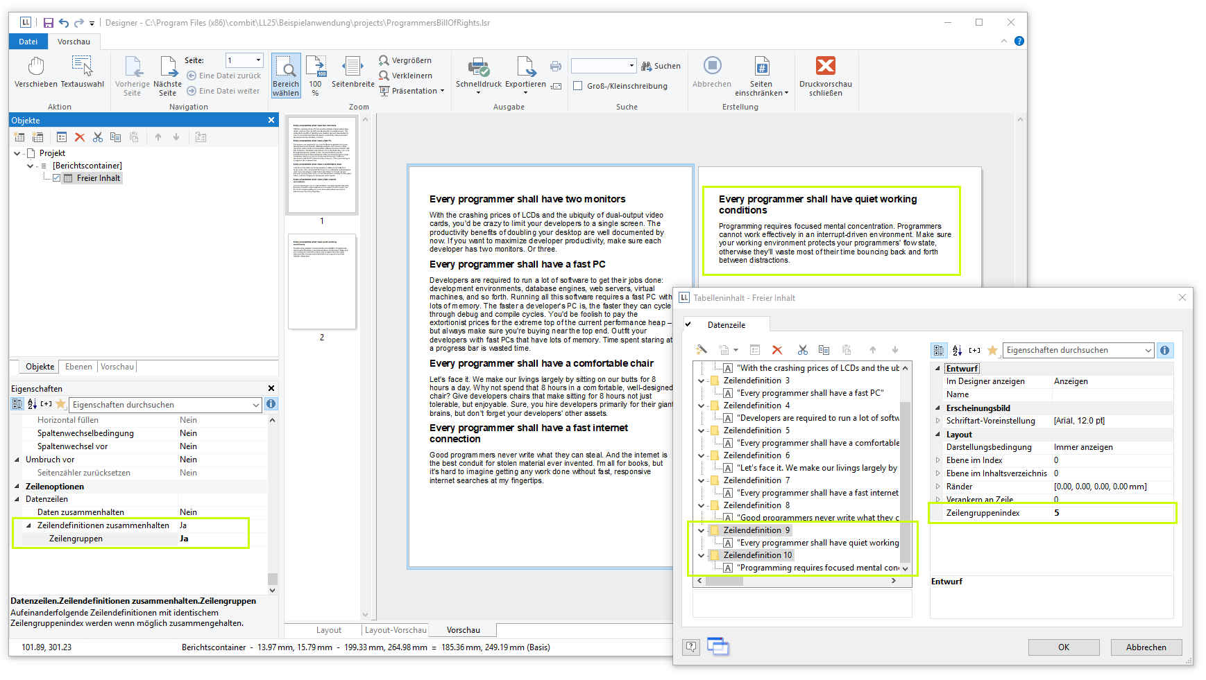 Wenn lediglich einzelne, aufeinanderfolgende Zeilendefinitionen nicht getrennt werden sollen, können Sie dies über die Spalten-Eigenschaften "Zeilengruppenindex" definieren. Voraussetzung ist, dass Sie die Tabellen-Eigenschaft "Datenzeilen > Zeilendefinitionen zusammenhalten > Zeilengruppen" aktiviert haben. Aufeinanderfolgende Zeilen mit gleichem Zeilengruppenindex (größer 0) werden dann, wenn möglich, zusammengehalten.