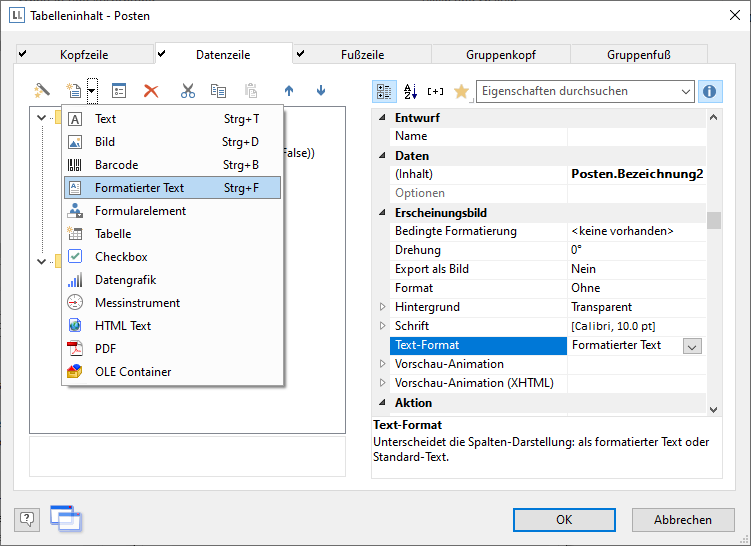 4. Im Eigenschaften-Dialog des Tabellen-Objekts fügen Sie dann eine Spalte ein. In unserem Fall möchten wir das Anschreiben als Formatierter Text erstellen. Wählen Sie daher über den kleinen Pfeil rechts der Schaltfläche den Eintrag "Formatierter Text" aus.