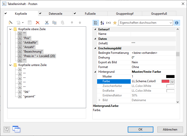 4. Wählen Sie als Hintergrund die Eigenschaft "transparent" um keinen Hintergrund anzuzeigen oder wählen Sie als Farbe z. B. LL.Color.SkyBlue. Die LL.Color-Farben erreichen Sie über die Pfeil-Schaltfläche. Den Standard-Farbdialog über die ...-Schaltfläche.