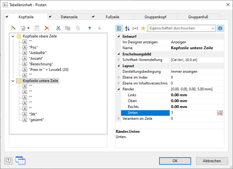 Damit steht Ihnen die Eigenschaft "Ränder" zur Verfügung. Wählen Sie als "Rand unten" z. B. 5mm um den Abstand unterhalb der Spaltenüberschrift zu bestimmen.