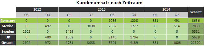 Sie können somit z. B. Umsatzverläufe pro Jahr und Region untersuchen, Auswertung der Verkäufe nach Stückzahlen und Kunden, wobei Sie dann Randsummen nach Quartalen und Jahren bilden können.