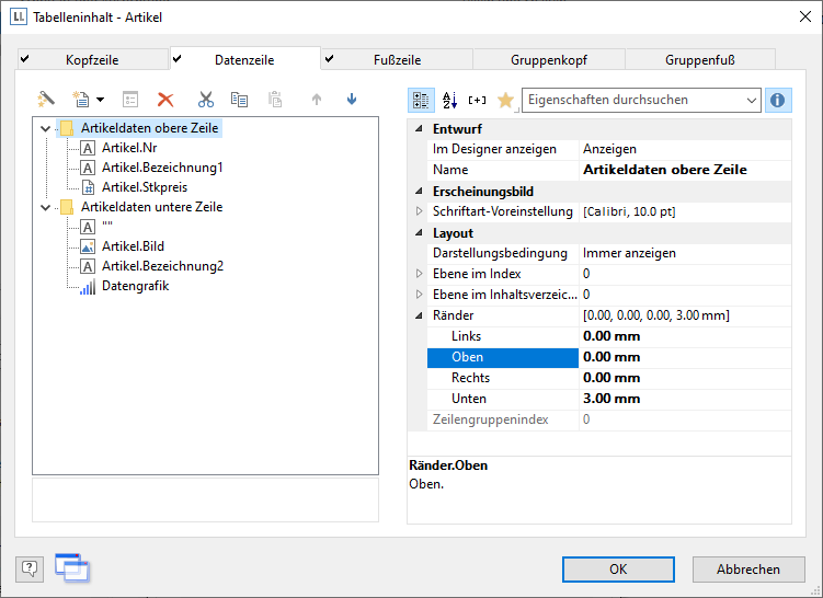 ▪ Name der Zeile z. B. "Artikeldaten obere Zeile". Dies ermöglicht es Ihnen bei komplexen Layouts, diese Zeile schnell wiederzufinden.