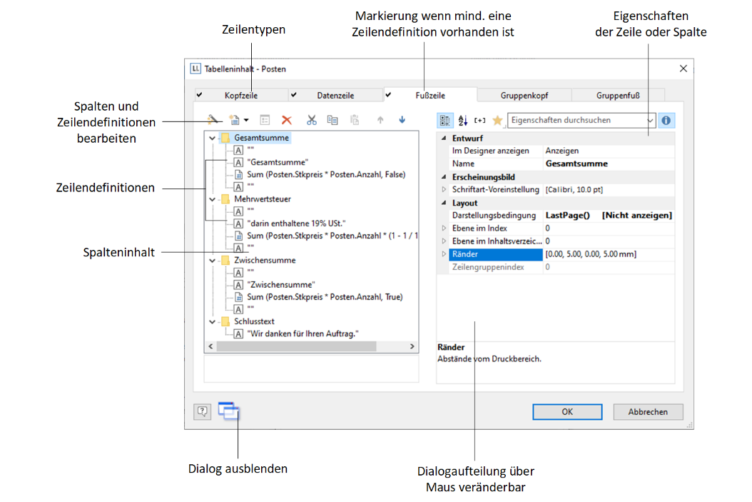 ▪ Fußzeilen werden ganz am Ende der Tabelle dargestellt und können abschließende Informationen der darüber ausgegebenen Datenzeilen enthalten.