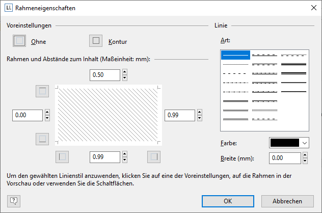 Rahmeneigenschaften und Abstände können über einen Dialog definiert werden. Um die gewählte Linienart, die Farbe oder die Breite anzuwenden, klicken Sie auf eine der Voreinstellungen, auf die Linien der Vorschau oder verwenden Sie die Schaltflächen. |
