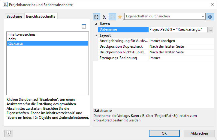 Über Projekt > Berichtsabschnitte kann ein Rückseitendruck definiert werden. Zur Druckzeit werden die entsprechenden Werte ausgelesen und die Datei auf jeder Rückseite oder nur auf der ersten bzw. hinter der letzten Seite ausgegeben.