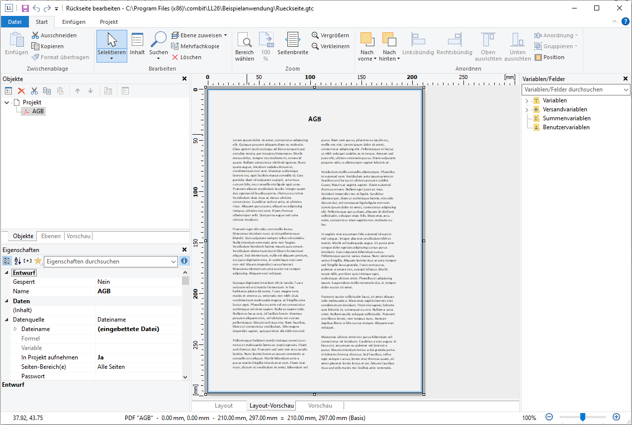 6. Passen Sie die Vorlage entsprechend an. Diese Druckvorlage können Sie jederzeit über die Eigenschaft "Dateiname" zum Bearbeiten öffnen.