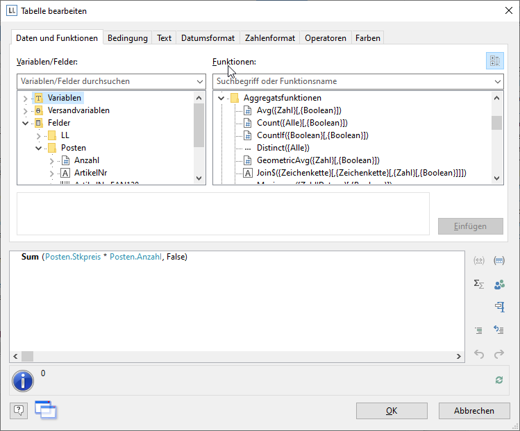 Tippen Sie diese entweder direkt in den Ergebnisbereich im Formel-Assistent oder wählen Sie die Funktion aus der Liste der Aggregatsfunktionen per Doppelklick aus. Als Parameter geben Sie den zu summierenden Wert an, also in diesem Fall Anzahl*Stückpreis.