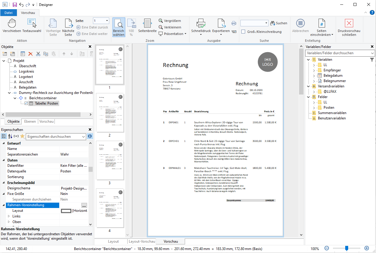 7. Da diese Fußzeile auch bei einer mehrseitigen Rechnung nur auf der letzten Seite ausgegeben werden soll, geben Sie bei der Zeileneigenschaft "Darstellungsbedingung" die Funktion "LastPage()" oder "LastFooterThisTable()" an.