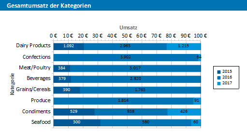 Das Tortendiagramm aus dem ersten Beispiel erlaubt einen Überblick über die Prozentanteile des gesamten Auswertungszeitraums. Um nun aber Trends erkennen zu können, wäre es schön, zu sehen wie sich die Anteile im Laufe des Auswertungszeitraums verschoben haben. Genau für diese Anwendung können Sie ein relativ gestapeltes Balkendiagramm verwenden. Der jeweilige Anteil an der Balkenlänge entspricht direkt dem Umsatzanteil der jeweiligen Produktkategorie.