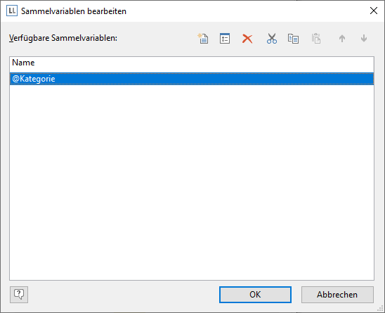 2. Im folgenden Dialog erstellen Sie über die Schaltfläche "Neue Variable einfügen" eine neue Variable. Daraufhin erscheint ein Eingabedialog für die Bezeichnung der neuen Variablen. Vergeben Sie einen aussagekräftigen Namen, z. B. "Kategorie", das Zeichen "@" wird automatisch an den Anfang gesetzt.