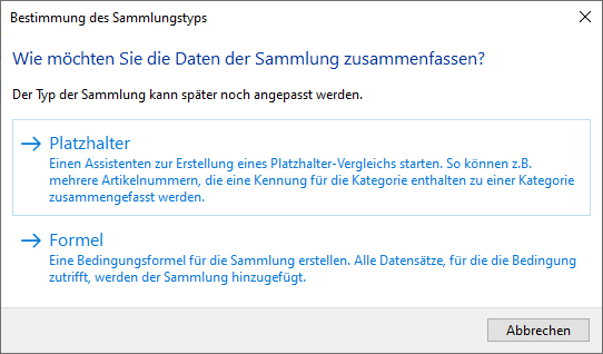 4. Über die Schaltfläche "Neue Sammlung einfügen" legen Sie dann die Kategoriezuordnung an. Wählen Sie für unser Beispiel mit der Artikelnummer den Eintrag "Platzhalter".
