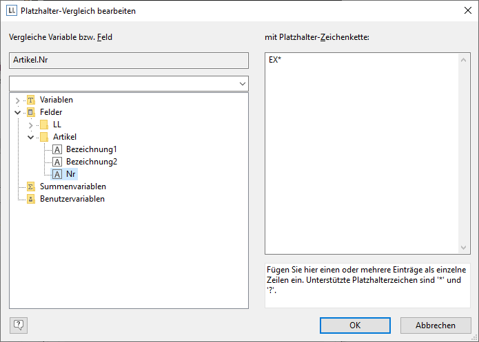 5. Es öffnet sich ein Dialog für die Erstellung des Platzhalter-Vergleichs. Wählen Sie das Feld "Artikel.Nr" und geben Sie die Platzhalter-Zeichenkette an: EX*. Fügen Sie mehrere Einträge als einzelne Zeilen ein. Unterstützte Platzhalter sind "*" und "?".