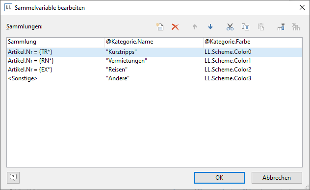 Es gibt daher in den Daten kein Kategorie-Feld, das Sie z. B. in einem Diagramm benutzen könnten um den Durchschnittspreis eines Artikels je Kategorie darzustellen. Mit Sammelvariablen haben Sie aber eine Möglichkeit, die Daten der verschiedenen Kategorien zu sammeln und Eigenschaften wie einen Kategorienamen oder eine Farbe zu bestimmen.