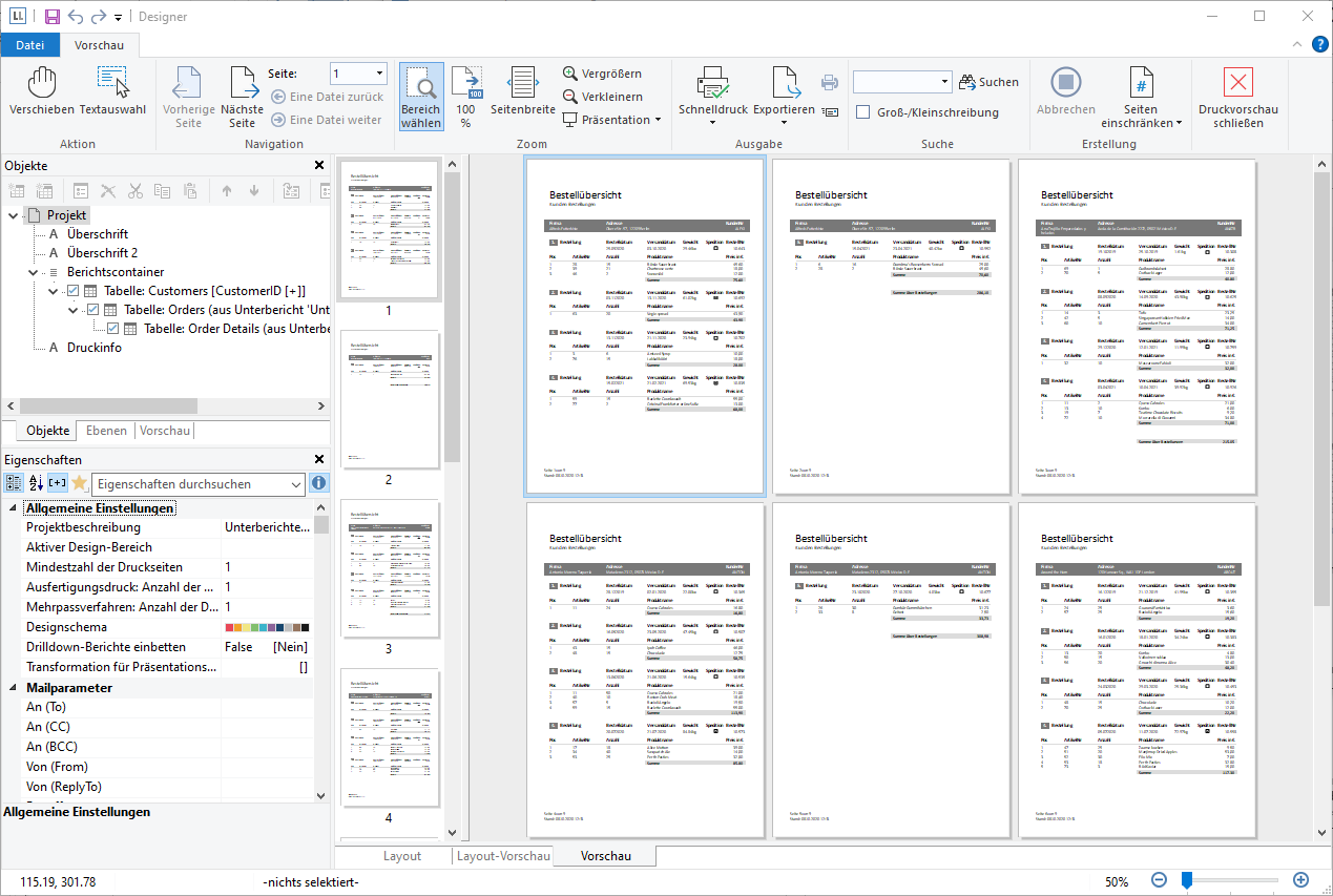 Bei komplexen Projekten mit hierarchischen Tabellen kann es sinnvoll sein, vor Ausgabe einer Datenzeile der "obersten" Tabelle einen Seitenumbruch zu erzeugen. Nutzen Sie dazu die Eigenschaft "Seitenwechselbedingung".