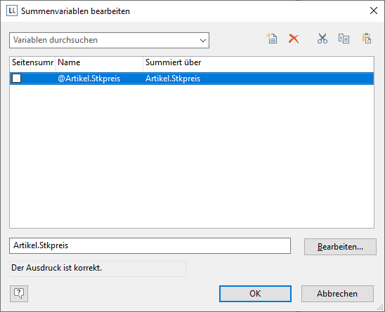 Summenvariablen können dazu benutzt werden, Summen über Datensätze hinweg zu bilden, z. B. in einer Tabelle die Summe über die Spalte "Artikel.Stkpreis" um den Gesamtpreis zu errechnen. Solche Summen sind zulässig für alle numerischen Variablen oder für Ausdrücke, die als Ergebnis einen numerischen Wert liefern.