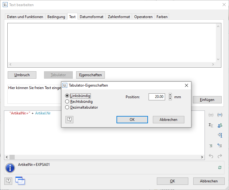 Über die Schaltfläche "Tabulator" erzeugen sie einen Tabulator, über die Schaltfläche "Eigenschaften" bestimmen Sie Position und Ausrichtung.