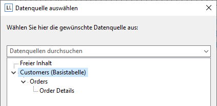 Viele Anwendungen übergeben die Beziehungen zwischen Tabellen, so dass diese Verknüpfungen im Designer zur Verfügung stehen. Im "Datenquelle auswählen"-Dialog werden diese Relationen dann hierarchisch dargestellt, also z. B. Customers>Orders>OrderDetails.