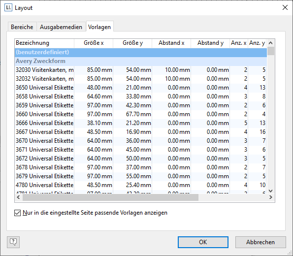 Im Seitenlayout für Etiketten können Sie über die Registerkarte "Vorlagen" unter zahlreichen vordefinierten Etikettenformaten verschiedener Hersteller auswählen. Damit wird automatisch festgelegt, wie groß die einzelnen Etiketten sind und wie viele sich davon wie auf dem Blatt verteilen.
