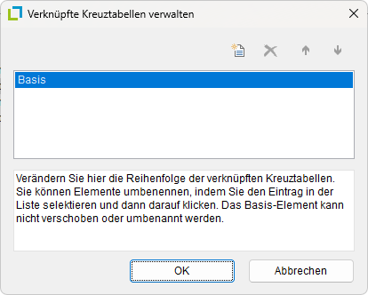 Dabei können die Zwischensummierungen ausgeblendet werden. Zudem können beide Kreuztabellen-Teile auch über unterschiedliche Werte aggregieren. Über die Auswahlliste "Daten für Kreuztabelle" wird bestimmt, welche Kreuztabelle bearbeitet wird. Standardmäßig steht hier nur die "Basis" zur Verfügung.